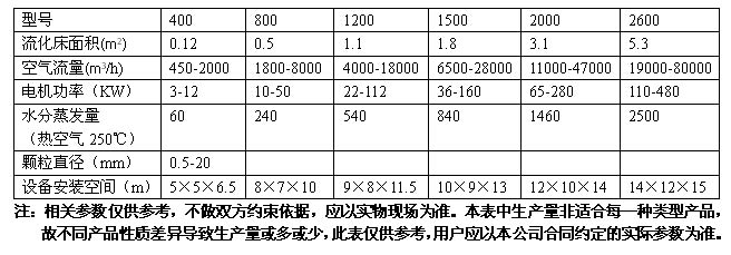 圓形連續(xù)噴霧流化造粒機系列技術參數(shù)表:
